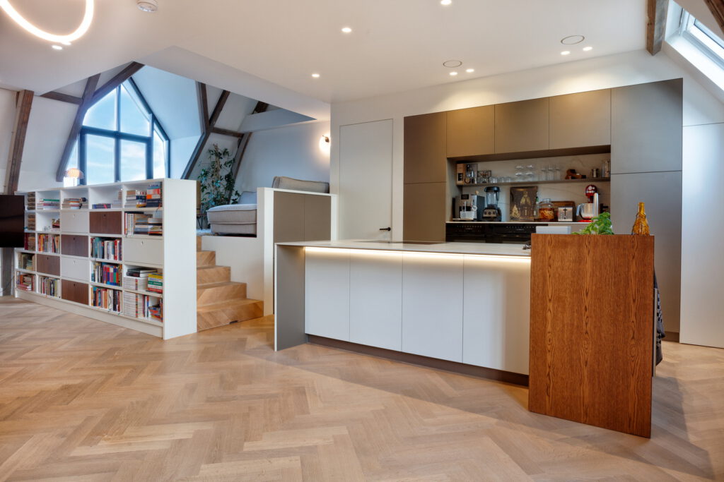 De gekozen materialen versterken het ruimtelijke karakter van de woning. Warm hout, gecombineerd met rustige, moderne fronten, zorgt voor een uitgebalanceerde en eigentijdse uitstraling. De visgraatvloer voegt dynamiek en luxe toe, terwijl het geheel een rustige basis behoudt. In de keuken komt dit samen in een strak vormgegeven eiland waarin functionaliteit en esthetiek elkaar ontmoeten.