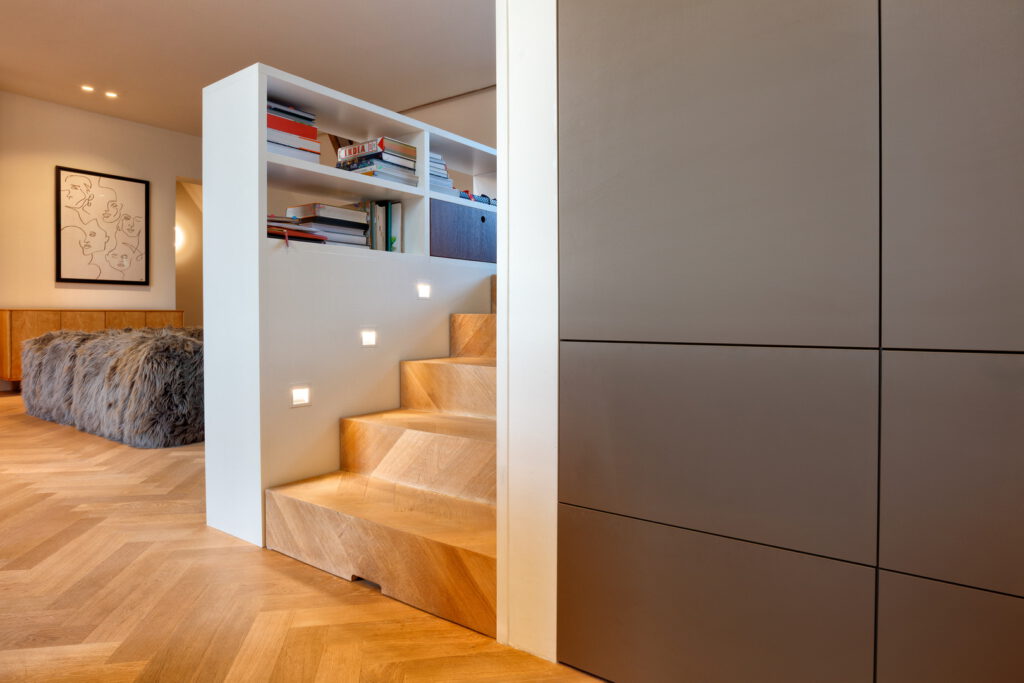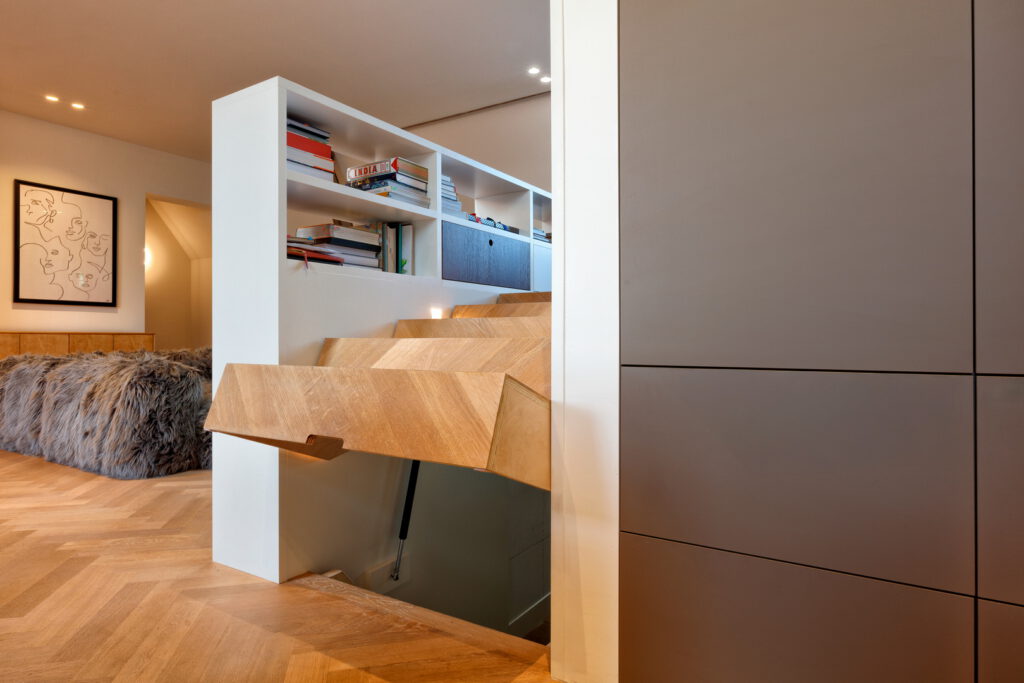 De maatwerk trap vormt een belangrijk onderdeel van het interieurconcept. Door de efficiënte opbouw neemt de trap weinig ruimte in beslag en verbindt hij de verdiepingen op een vanzelfsprekende manier. Tegelijkertijd is de trap meer dan een functioneel element: hij fungeert als meubel en draagt bij aan een heldere indeling van de ruimte. De integratie van opbergruimte onder en rondom de trap zorgt voor maximale ruimtebesparing.