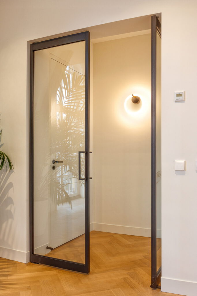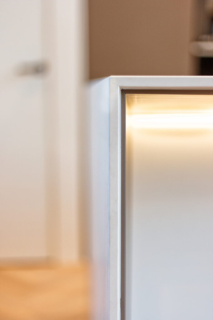 Maatwerk kasten en scheidingswanden zijn zo ontworpen dat ze de ruimte structureren zonder deze af te sluiten. Opbergruimte is subtiel geïntegreerd, waardoor het interieur overzichtelijk blijft en de woning visueel groter aanvoelt. Dit slimme ruimtegebruik maakt het interieur flexibel en geschikt voor dagelijks gebruik.